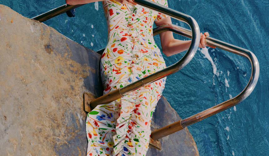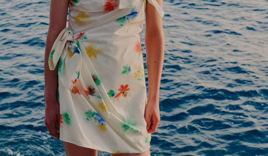 Shapes recall the flow of water: curved lines in optical prints on poplin, spray flowers and watercolour broom — painted by milanese artist and MSGM-friend Luca De Gaetano — introducing the brand’s indie graphicism on cotton canvas and mesh. In hyperpop snapshots, small multicoloured flowers scanned and imprinted on jersey. An elastic grosgrain belt recalls the iconic design of Mario Bellini's "Figura" chair for Vitra from 1984.