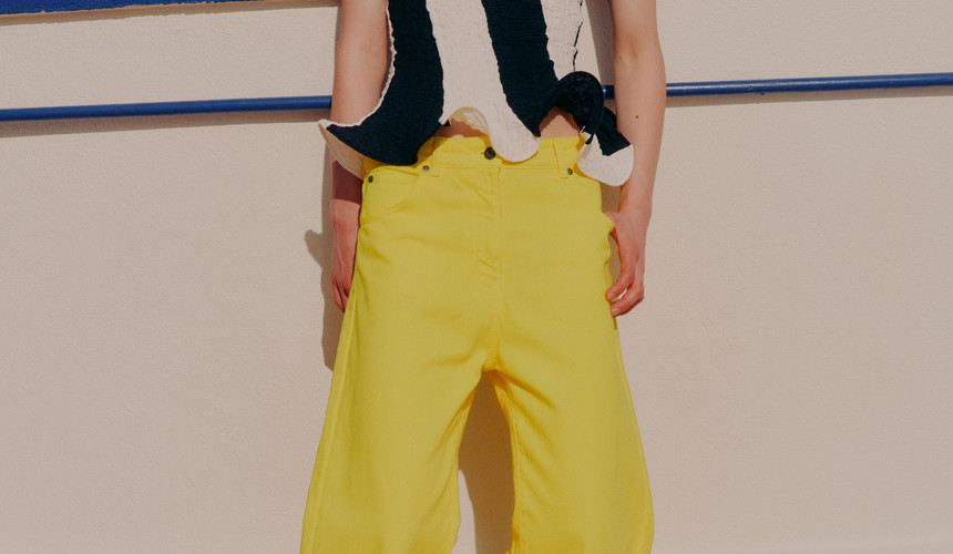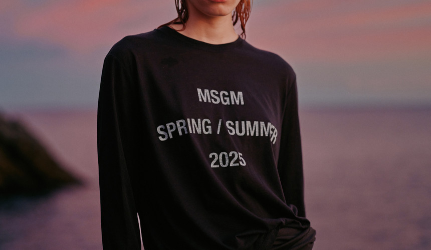 The presentation of the collection is an extension of the story. Fosbury Architecture has imagined an ideal beach inside the MSGM headquarters: blue sand unfolds like in a labyrinth of waves, while a fluorescent yellow net envelops the building, decontextualising it with irreverence. A three-dimensional representation of the dialogue between fashion and architecture, between fabrics and landscape, between man and his environment. Like a second chapter after "The Sea and I®", the Mediterranean is not just a geographical destination, but an emotional concept.