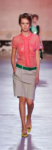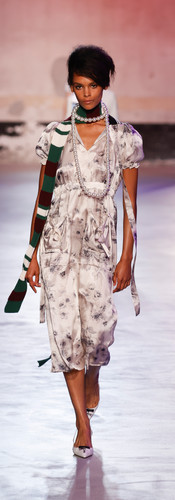 Fully hand-sequinned dresses, paired with parkas, PVC/Napa leather, and little rhinestone bow mules, coexist alongside pony skin elements from under which pink lace lingerie peeks out. Slim straight pencil skirts, styled with thick hand-knit wool sweaters and colourful loose-fitting parkas, take turns with mannish bandanna collar striped shirts. The accessories complemented the aesthetics with slingbacks and ballerina flats, in chequerboard black-and-white or in solid tones with a little bow. The show was not deprived of the iconic N°21 Jeanne bag, now in couture hues of quilted satin.